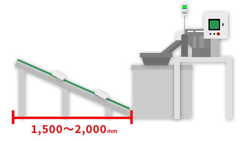 一般的な傾斜コンベアは傾斜部だけで1,500〜2,000mm、パーツカウンターを含めると3,000mm近く必要です。搬送作業は直接生産に寄与しないため、限られたスペースの工場ではこの設置面積をできるだけ抑えたいものです。一方、コンベアリフターなら約1,000mmで済み、計数機や包装機を含めても約2,000mmと、半分ほどのスペースで導入できます。